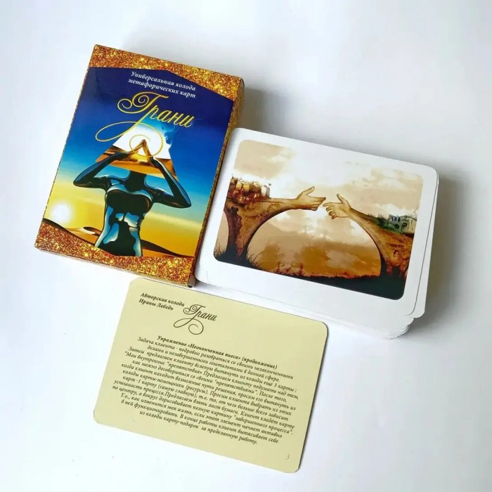 В таком случае, где же находится та тонкая грань с помощью, которой мы определяем границы взаимодействия собственного внешнего и внутреннего мира?! Данные вопросы Ваш клиент весьма эффективно сможет разобрать с помощью колоды метафорических ассоциативных карт «Грани».