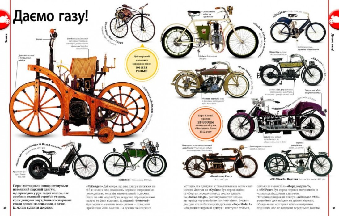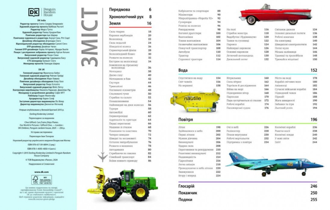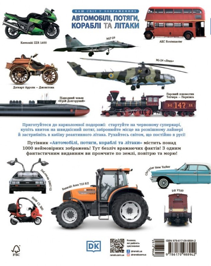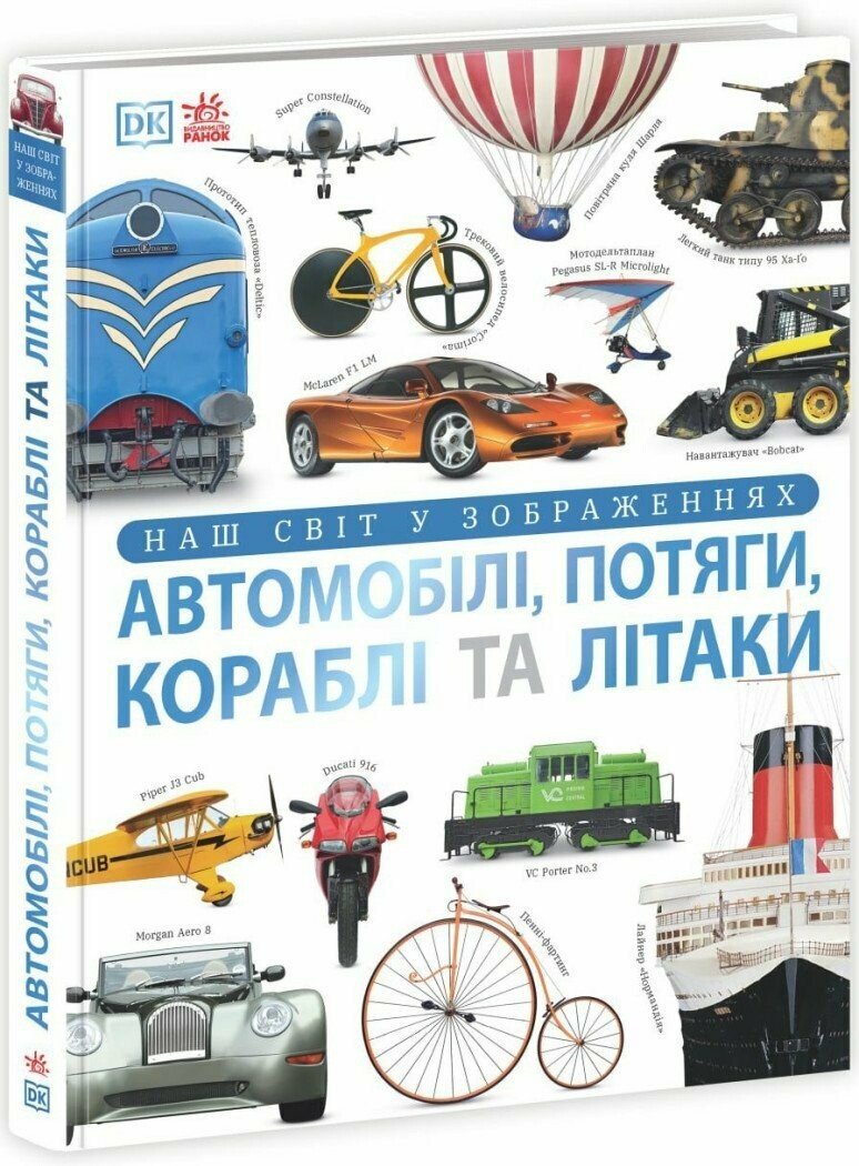 Усе, що має крила, колеса чи вітрила. Що їде по асфальту чи по рейках. Усі відважні піонери й рекордсмени — на сторінках цієї надзвичайної енциклопедії! Тут стільки цікавого про унікальні розробки й винаходи, про захопливі випробування! Приготуйтеся до карколомної подорожі. З цим неймовірним путівником вирушайте на червоногарячому суперкарі, купіть квиток на швидкісний потяг, забронюйте місце на розкішному лайнері й зстрибніть в кабіну надзвукового реактивного літака. Рухайтесь світом, що постійно в русі!Книжка закохає в себе не тільки юних читачів, а й їхніх батьків! Тож занурюйтесь в дивовижну історію транспорту, про яку можна не лише прочитати. Її можна буквально побачити! Ці неймовірні, дивовижні, карколомні, шокуючі види, типи й моделі — яскраві детальні зображення хочеться роздивлятися знову й знову… І зрештою остаточно прояснити, скільки ж разів винаходили велосипед!Путівник «Автомобілі, потяги, кораблі та літаки» містить понад 1000 неймовірних зображень! Тут безліч вражаючих фактів! З одним фантастичним виданням ви промчите по землі, повітрю та морю!
