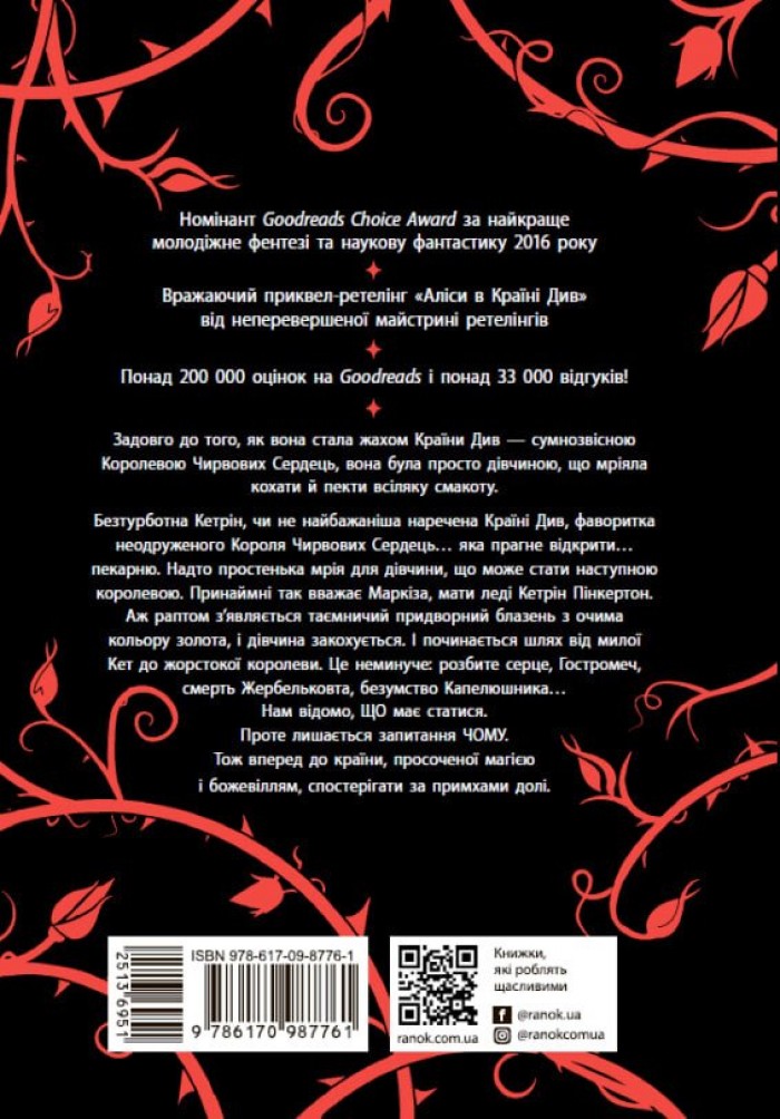 Вражаючий, захопливий роман для молоді від королеви ретелінгів! Лабіринти, двері й дзеркала, Чешир, Божевільний Капелюшник, Чирвовий Валет, пан Гусінь, Шалений Заєць Жербельковт і, звісно, вона — Королева Чирвових Сердець! Усім відомо, чим завершилася історія, коли в неї потрапила Аліса. Проте що було до того?