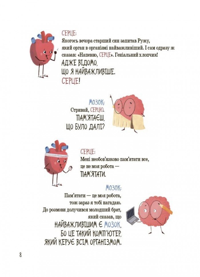 Будьмо знайомі! Ми — твої внутрішні органи. Ми живемо у твоєму тілі, працюємо і дбаємо про те, щоб твій організм працював злагоджено вдень та вночі! А хто з нас НАЙВАЖЛИВІШИЙ? Мозок? Легені? А може, серце? Ти дізнаєшся це, коли прочитаєш книжку. А ще точно дізнаєшся: - як називаються органи тіла; - як вони працюють; - за що кожен з них відповідає; - що відбувається, коли вони з якихось причин працюють не так, як треба. Тож не марнуй часу: розгортай книжку і дізнавайся відповідь на запитання і наші таємниці!