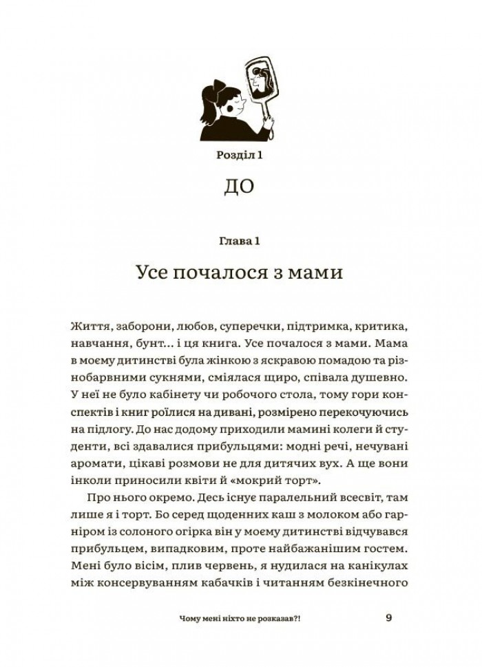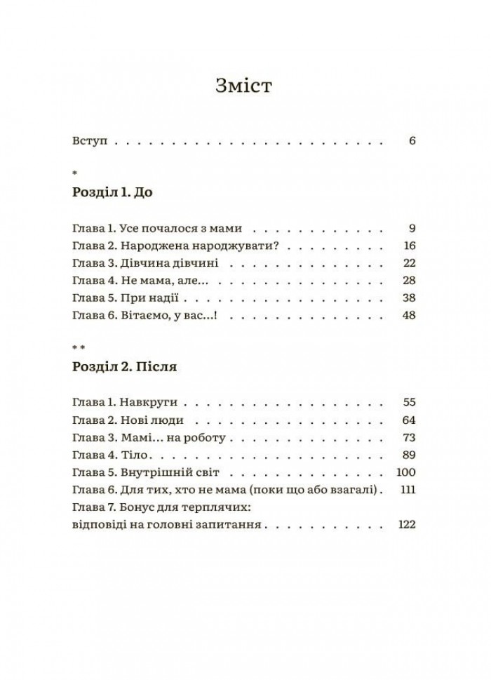 Тут ви не знайдете повчань і порад з виховання або рекомендацій зі самовдосконалення, зате отримаєте списки класних книг і фільмів, низку життєвих історій про те, як не загубитися і не розгубитися, коли життя і світ вигадують дедалі нові випробування. Прочитавши книжку, можливо, відчуєте, що ви у своєму досвіді не самотня. Ця книжка про всіх мам. І для всіх мам. Для приємного та легкого читання людей будь-якого віку, статі, зросту та статусу.