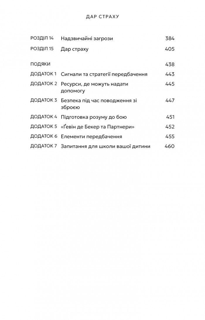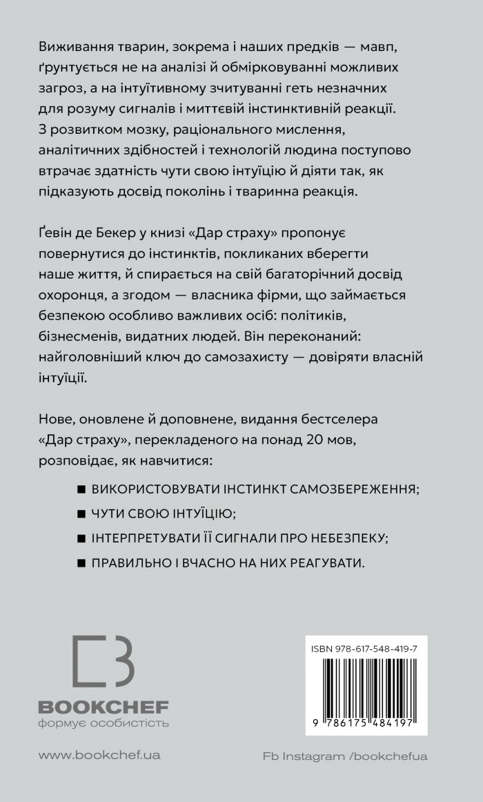Виживання тварин і наших предків — мавп ґрунтувалося не на аналізі й обмірковуванні можливих загроз, а на інтуїтивному зчитуванні геть незначних для розуму сигналів і миттєвій інстинктивній реакції. З розвитком мозку, раціонального мислення, аналітичних здібностей і технологій людина поступово втрачала здатність чути свою інтуїцію й діяти так, як підказують досвід поколінь і тваринна реакція. У книзі «Дар страху» автор пропонує повернутися до інстинктів, покликаних уберегти наше життя, й спирається на свою багаторічну роботу охоронця, а згодом — власника фірми, що займається охороною особливо важливих осіб: політиків, бізнесменів, видатних людей. Найголовніший ключ до самозахисту — довіряти власній інтуїції. Книга «Дар страху» розповідає, як цьому навчитися.