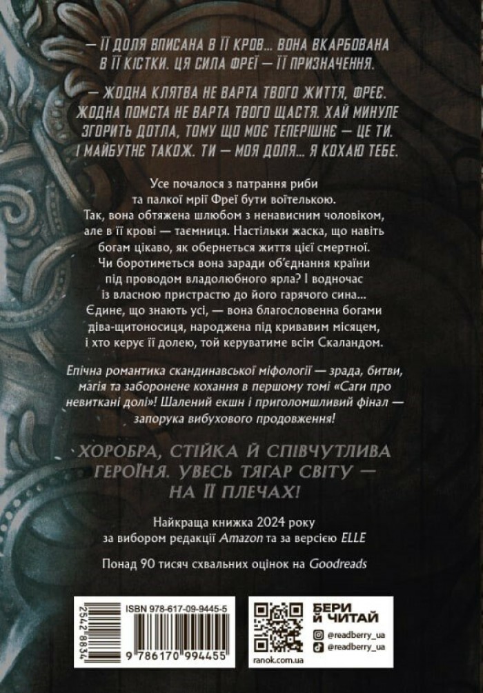 Епічна романтика скандинавської міфології — зрада, битви, магія та заборонене кохання в першому томі «Саги про невиткані долі»! Шалений екшн і приголомшливий фінал — запорука вибухового продовження! І тепер, здобувши Фрею за другу дружину, владолюбний ярл відчайдушно прагне корони, а воїтелька мусить битися, долаючи випробування, які посилають боги. Та найбільше її випробування — це пристрасть, заборонене кохання до ярлового сина, Б’єрна.