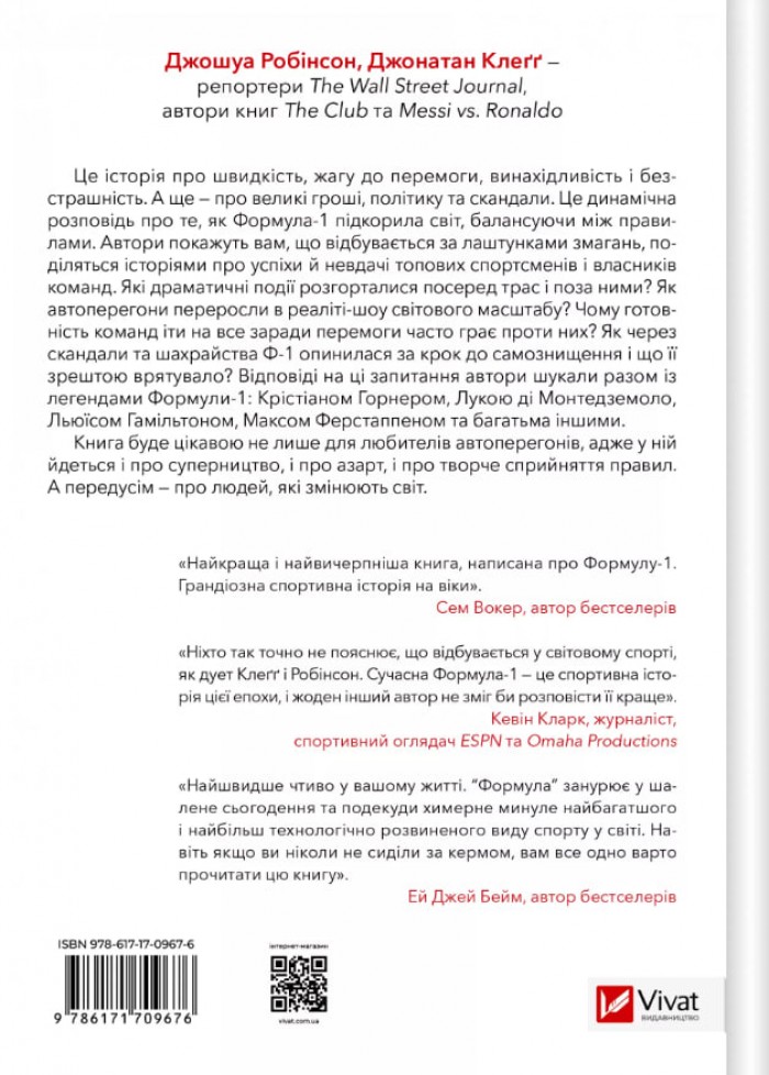 Це історія про швидкість, жагу до перемоги, винахідливість і безстрашність. А ще — про великі гроші, політику та скандали. Це динамічна розповідь про те, як Формула-1 підкорила світ, балансуючи між правилами. Автори покажуть вам, що відбувається за лаштунками змагань, поділяться історіями про успіхи й невдачі топових спортсменів і власників команд. Які драматичні події розгорталися посеред трас і поза ними? Як автоперегони переросли в реаліті-шоу світового масштабу? Чому готовність команд іти на все заради перемоги часто грає проти них? Як через скандали та шахрайства Ф-1 опинилася за крок до самознищення і що її зрештою врятувало? Відповіді на ці запитання автори шукали разом із легендами Формули-1: Крістіаном Горнером, Лукою ді Монтедземоло, Льюїсом Гамільтоном, Максом Ферстаппеном та багатьма іншими.