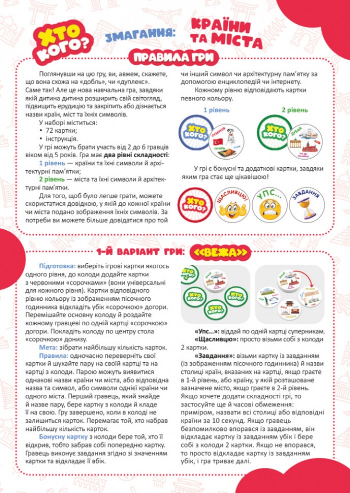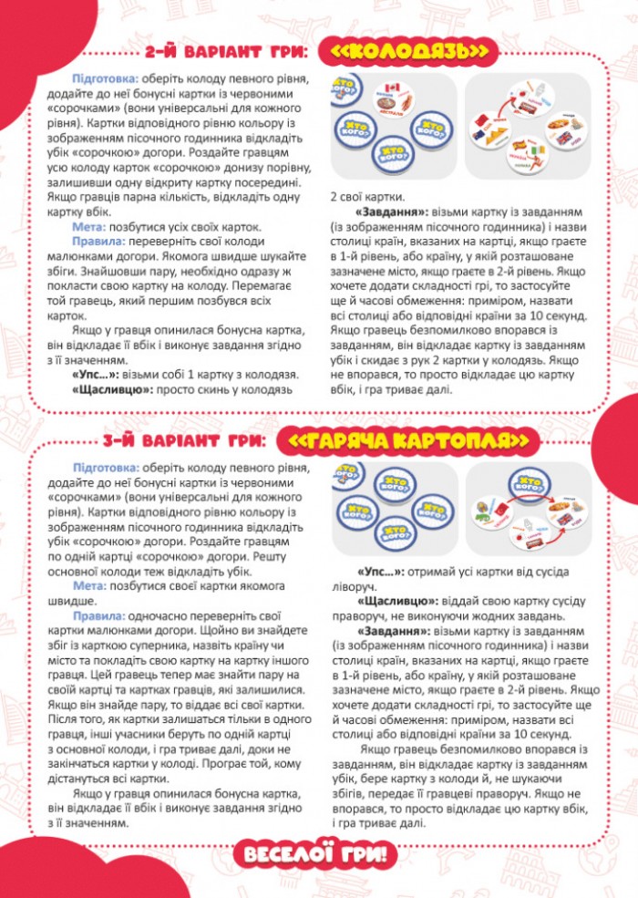 Тепер діти, окрім того, що розвиватимуть увагу, тренуватимуть зорову пам’ять та вміння зосереджуватися, ще й зможуть вдосконалити й розширити навички географічного знання. Ця гра буде цікавою не лише дітям від 5 років, а й старшим, бо має два рівні складності.
