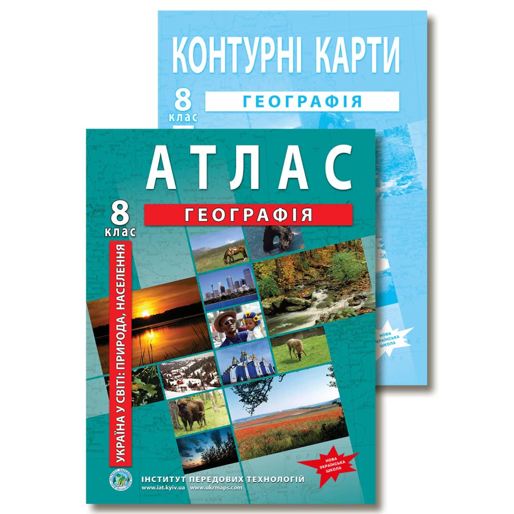 Комплект посібників: Атлас і контурні карти з географії для 8 класу. Україна в світі: природа, населення.,