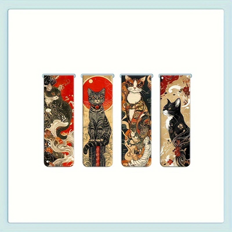 Комплект із чотирьох унікальних металевих закладок із зображенням котів у японському стилі - ідеальний подарунок для любителів читання та поціновувачів витонченого дизайну.