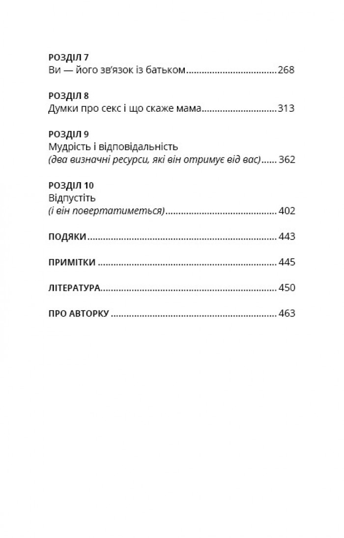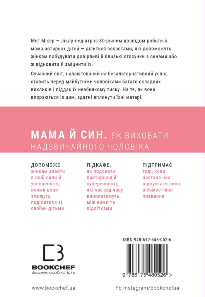 Меґ Мікер — лікар-педіатр із 30-річним досвідом роботи й мама чотирьох дітей — щедро ділиться секретами, які допоможуть жінкам побудувати довірливі й близькі стосунки з синами або ж відновити й зміцнити їх. Сучасний світ, налаштований на безальтернативний успіх, ставить перед майбутніми чоловіками багато складних викликів і піддає їх неабиякому тиску. На те, як із цим усім впораються хлопці, здатні вплинути їхні матері.