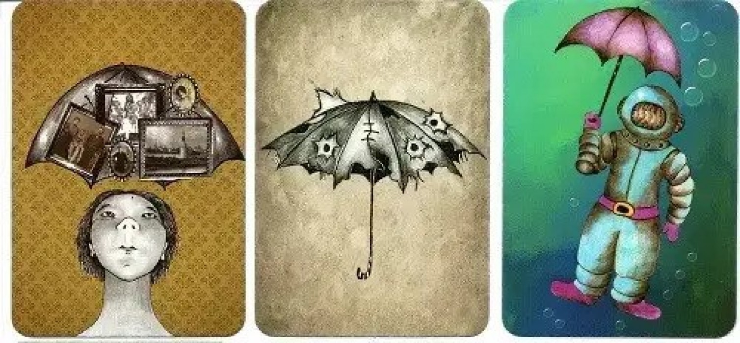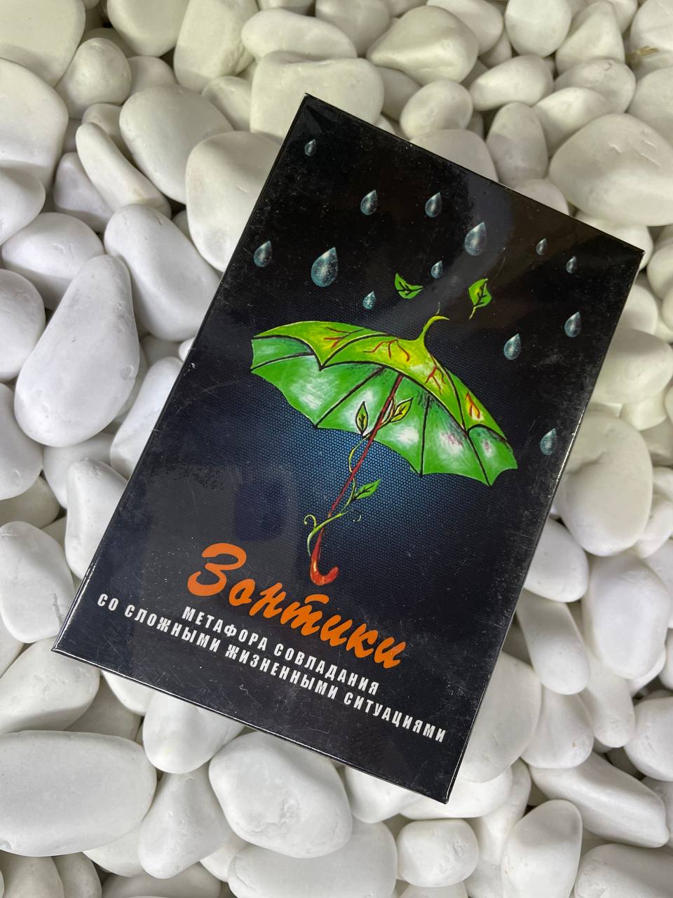 64 карти з незакінченими пропозиціями карта-схема, що відображає загальний алгоритм дій у складних ситуаціях інструкція Психологічний зміст Колода формувалася з опорою на існуючі в психології уявлення про прийоми та способи впоратися з проблемами. У психології вони визначаються як копінг-стратегії (від англ. Сoping). Це стратегії, що так чи інакше спрямовані на взаємодію з проблемною ситуацією; поведінка, покликана підтримати психологічну рівновагу. За допомогою метафоричних карт Парасольки ми можемо побудувати бесіду, переносячи наявні проблеми зовсім в інший контекст, створюючи поле для подальшої роботи за допомогою художніх образів. Можна розглянути стратегії подолання не як вроджені, постійні форми реагування, бо як допоміжні кошти, які за необхідності можна замінити більш відповідні. Можна побачити і зрозуміти, наскільки хороші способи реагування клієнта у складній ситуації: чи виконують вони своє завдання? Хто і коли подарував людині його улюблену парасольку (навчив так реагувати)? За яких обставин він уперше навчився ним користуватися (яка ситуація призвела до певних дій, реакцій)? Може, йому потрібна нова парасолька (звичні дії не призводять до бажаного результату)? Може, парасолька, яка добре захищає від сонця, не підходить для сильного дощу (різні ситуації потребують різних рішень)? Може, поки людина ховається від дощу під парасолькою, вона довкола себе не бачить і не помічає (а поряд є безліч інших рішень)? Це лише маленький перелік метафоричних питань, які можна поставити людині, працюючи з картами. Приклади вправ. Дозволяє побачити робочий арсенал стратегій людини, поміркувати над тим, у яких ситуаціях стратегії ефективні, а яких немає, які стратегії використовуються без урахування особливостей ситуації тощо. Поряд із малюнковими у роботі використовуються словесні картки, кожна з яких описує певну ситуацію