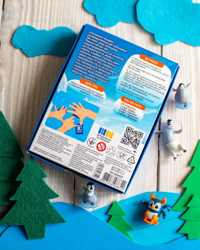 У наборі: 24 картки (7 з рибою, 5 з пінгвінами, 9 із завданнями, 3 хижаки), велюровий мішечок для зберігання карток.