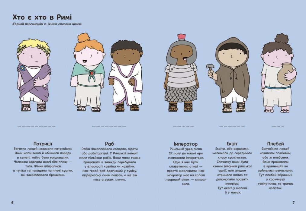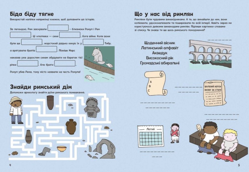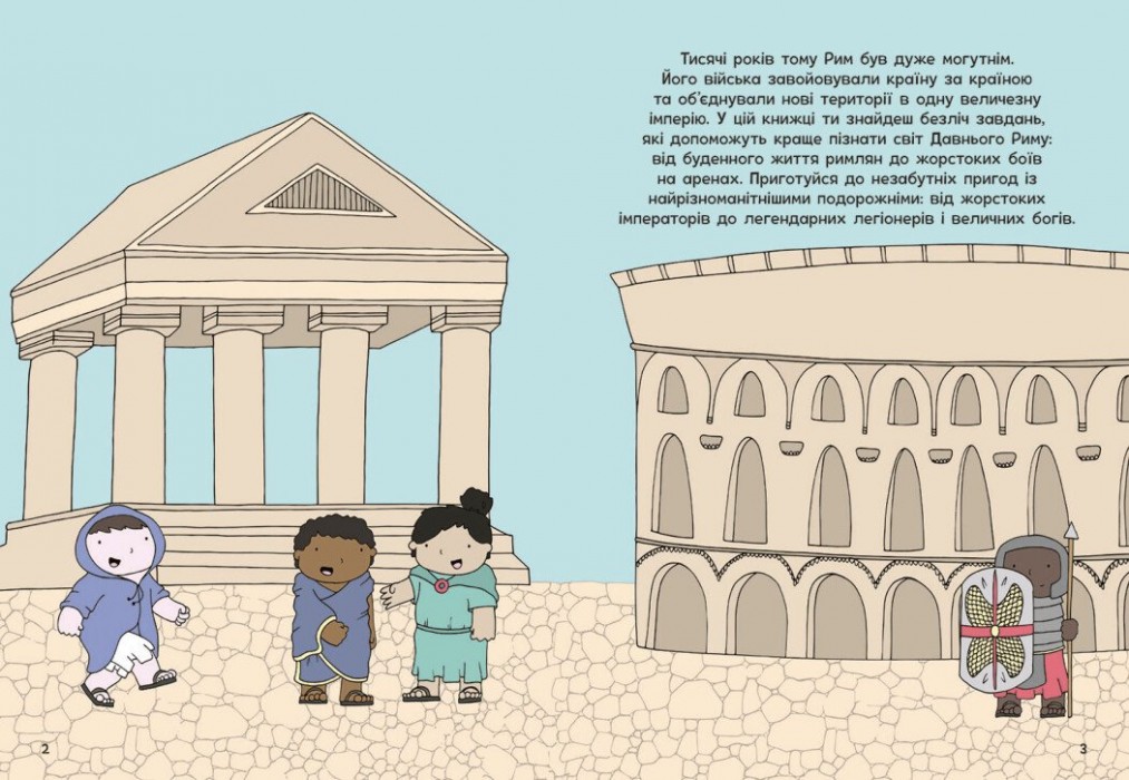 Запрошуємо до Римської імперії! Ця книжка-активіті познайомить малечу із життям давніх римлян. Тут аж 64 сторінки, на яких дитина виконуватиме захопливі завдання: лабіринти, головоломки, розмальовки, приклади, що натренують кмітливість і уважність. І все це — про римських воїнів, гладіаторів, імператорів, ремісників і простих містян. Як були влаштовані їхні домівки? Виведи археолога з лабіринту — і дізнайся. Яка була зброя у римських воїнів? Розплутай доріжки, щоб побачити. «Оживи» святкову вечерю за допомогою наліпок та створи вбрання за римською модою! Цікаво? То рушаймо!