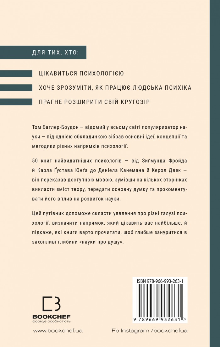 Якщо ви завжди хотіли знати більше про таку важливу галузь, як психологія, однак у вас ніколи не вистачало часу перечитати основні наукові праці, які формують найважливіші ідеї, — ця книга для вас. У кілька сотень сторінок автор умістив основні ідеї та концепції психології, викладені в 50 працях найвидатніших учених. Ви знайдете конспективний виклад творів як класиків, так і сучасних вчених, тож зможете осягнути розвиток психології як науки в розрізі історії. Ключові моменти книг відомих авторів, їх короткі біографії, «розкладені по поличках» концепції дадуть змогу ознайомитися з академічним курсом психології за досить короткий термін. Книгу варто прочитати психологам, психотерапевтам, людям, котрим потрібні знання з психології в професійній діяльності, а також усім, хто цікавиться психологією та хоче дізнатися про цю сферу науки та людського буття більше.