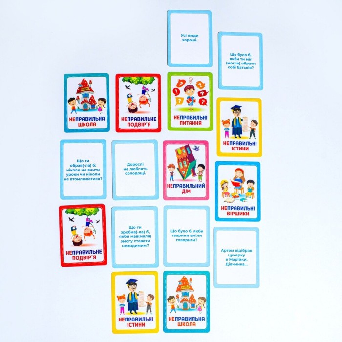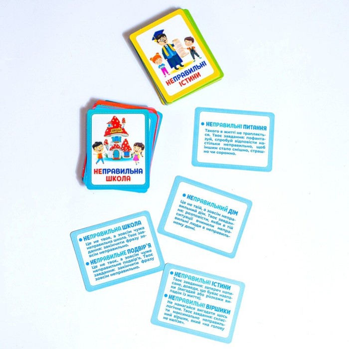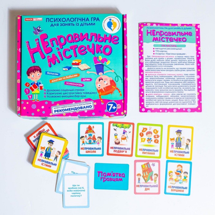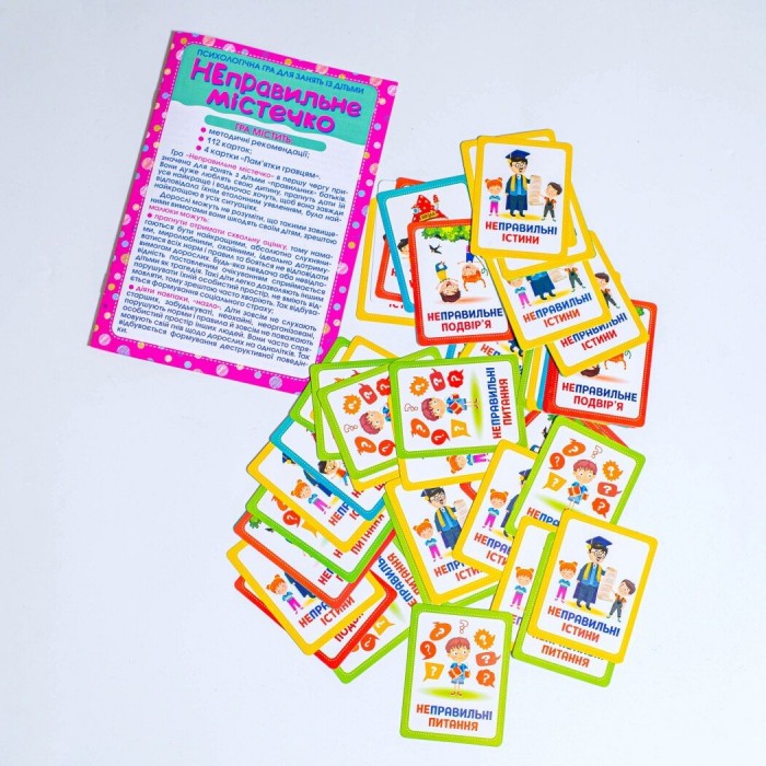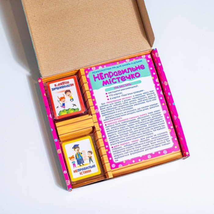 Відкрийте двері у світ яскравих емоцій та веселих моментів з картковою грою «Неправильне містечко»! Шукаєте подарунок, який не тільки розважить вашу родину, але й допоможе подолати соціальні страхи і складні питання? Це ідеальне рішення! Наш 3 в 1 продукт – це корисний подарунок, захоплююче дозвілля та шлях до щасливої родини! В «Неправильному містечку» розкриваються секрети боротьби зі страхами дітей і деструктивною поведінкою. Маючи 6 категорій карток, ця гра охоплює всі важливі сфери життя: від шкільних викликів до домашніх ситуацій. Знищте бар'єри спілкування між дорослими та дітьми, навчаючи їх самовираженню та міжособистісним стосункам! Тут немає заборон! Помилки – це ваше суперсила!