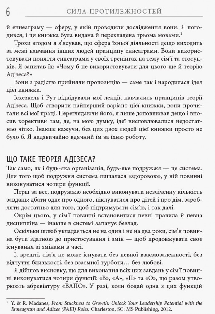 У сучасному світі немає місця сваркам у стосунках. Уся споживацька культура каже, що ідеальні пари без конфліктів існують, отже, треба лише шукати свою половинку. Досить у це вірити! Іцхак Калдерон Адізес заперечує цю теорію, натомість пропонує свою — про необхідне доповнення партнерів одне одного. Це особливо важливо сьогодні, коли попередня модель сім’ї з усталеними ролями чоловіка і дружини зруйнована, а нова ще не сформувалась. Адізес розробив методику, за якою стосунки — це живий організм, а проблеми спричинюються нестачею певних «вітамінів» у раціоні. У першій частині книжки «Сила протилежностей» автор знайомить читача із принципами цієї методики, а в другій пропонує терапевтичні заходи для урегулювання конфліктів і встановлення гармонії в парі.