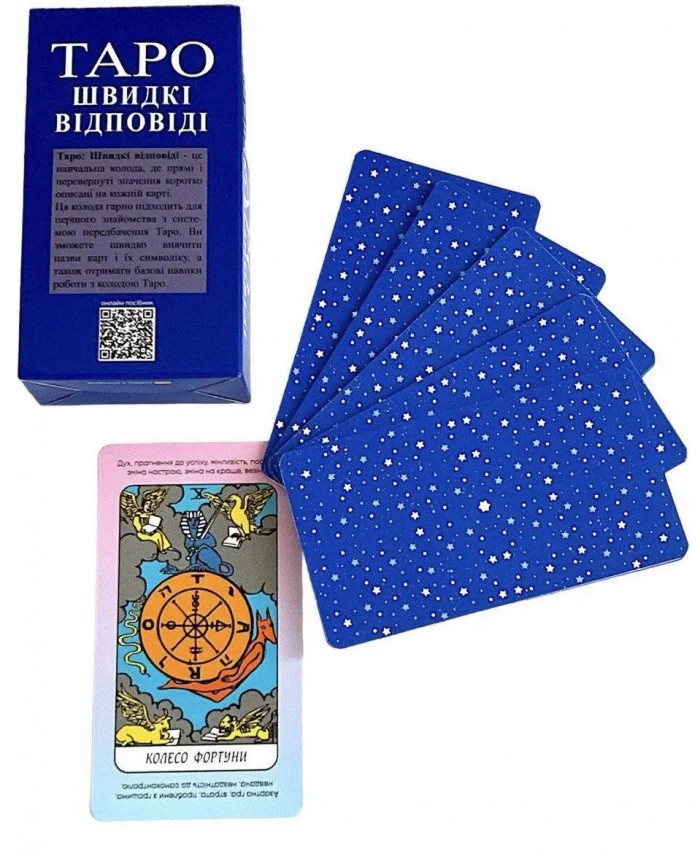 Одна з найпопулярніших колод Таро – Навчальна колода по Райдеру Уейту “Швидкі відповіді” Українською мовою + повноцінна онлайн книша по QR коду на коробці з картами. Якщо ви тільки починаєте свій шлях в таро, ця колода є ідеальною для вас, так як на кожній карті є підказки по значенню карти, а також є онлайн посібник з яким ви зможете більш ретельно розібратися з колодою та навчитися користуватися.